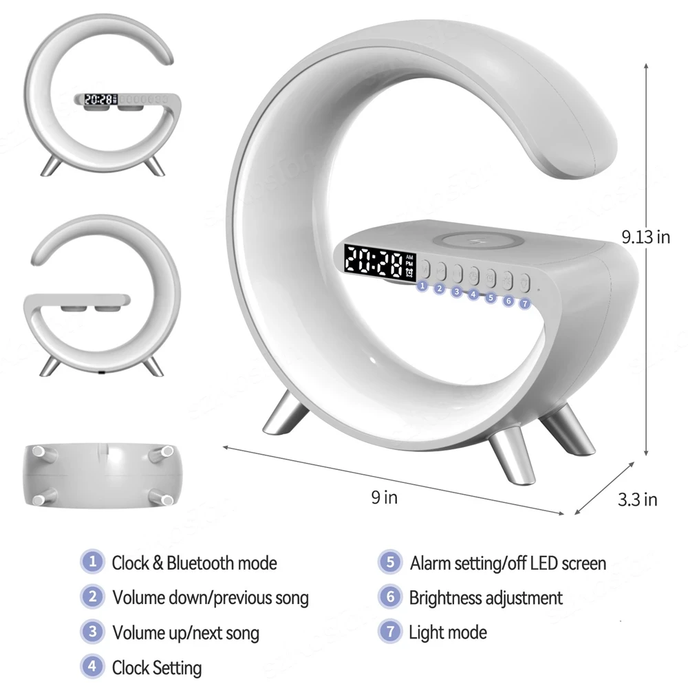 Les fonctions principales du produit: peut être utilisé comme lumière de réveil intelligente, lumière de sommeil, lumière ambiante de veilleuse; charge sans fil 15W; haut-parleurs compatibles Bluetooth, rythme musical; bouton et contrôle APP; 256 modes d'éclairage, 16 millions de couleurs